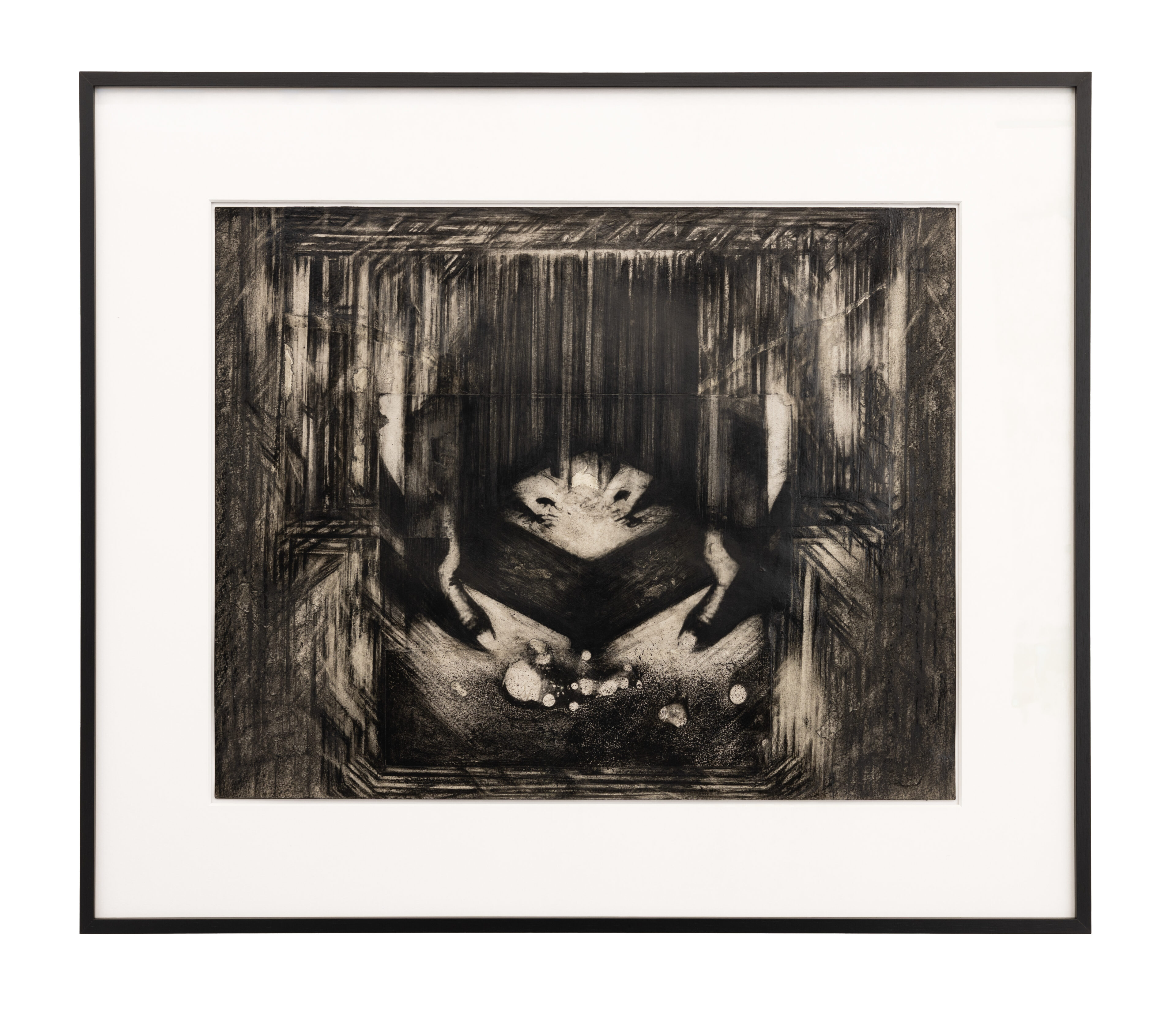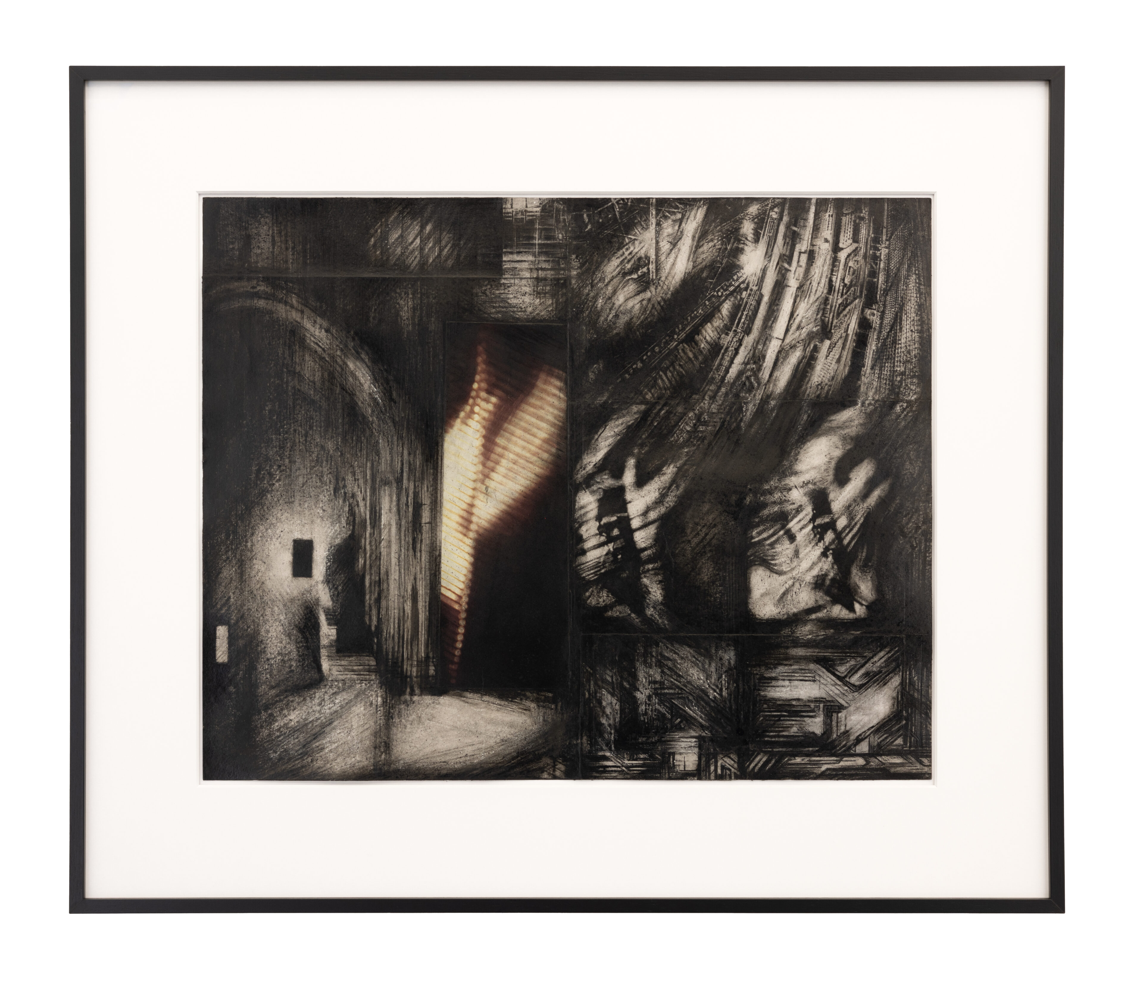 Eidolon I, 2023, UV-cured print on glass with hand painted sumi ink and guache, metal, 37.5 x 184 cm