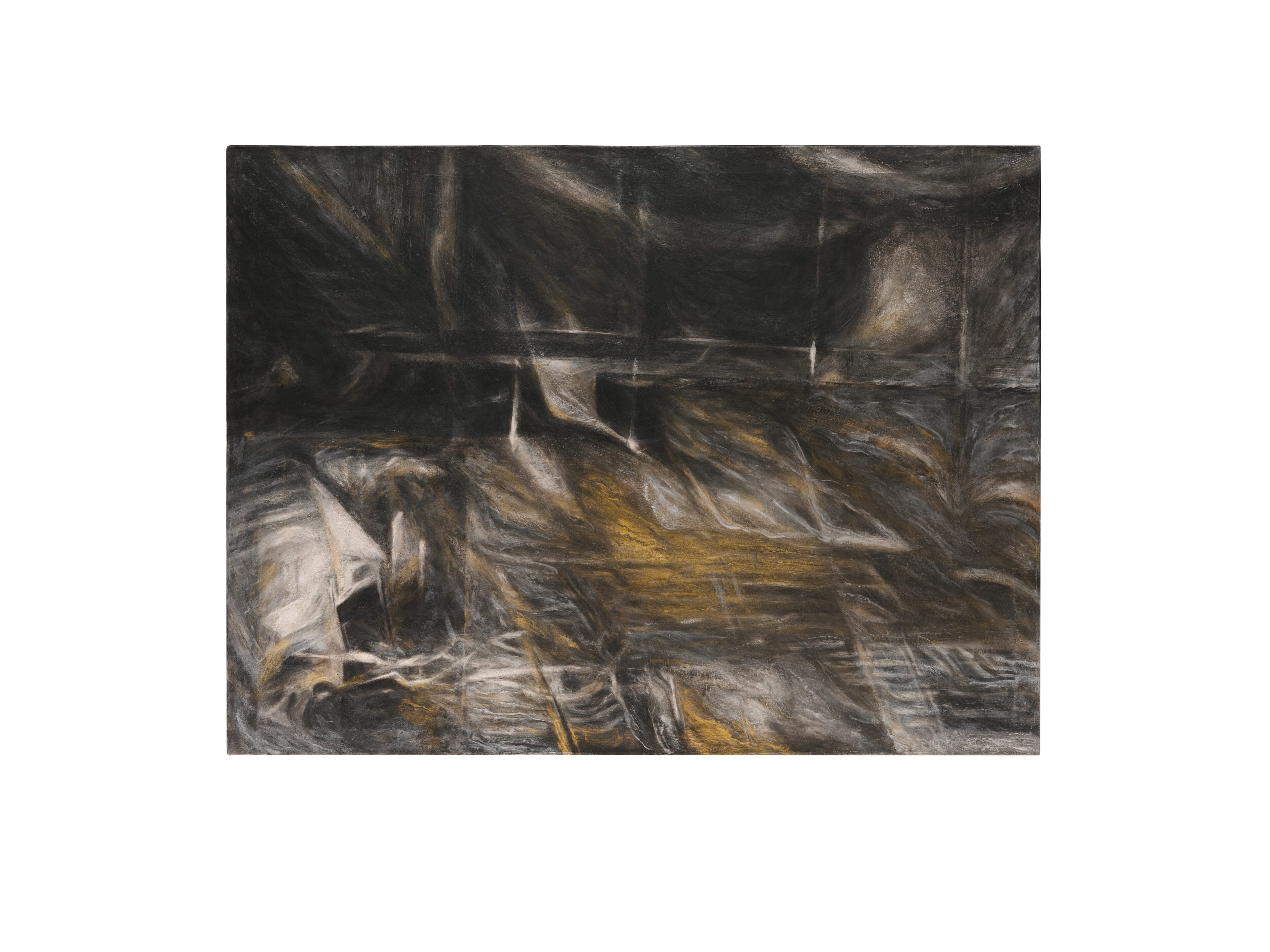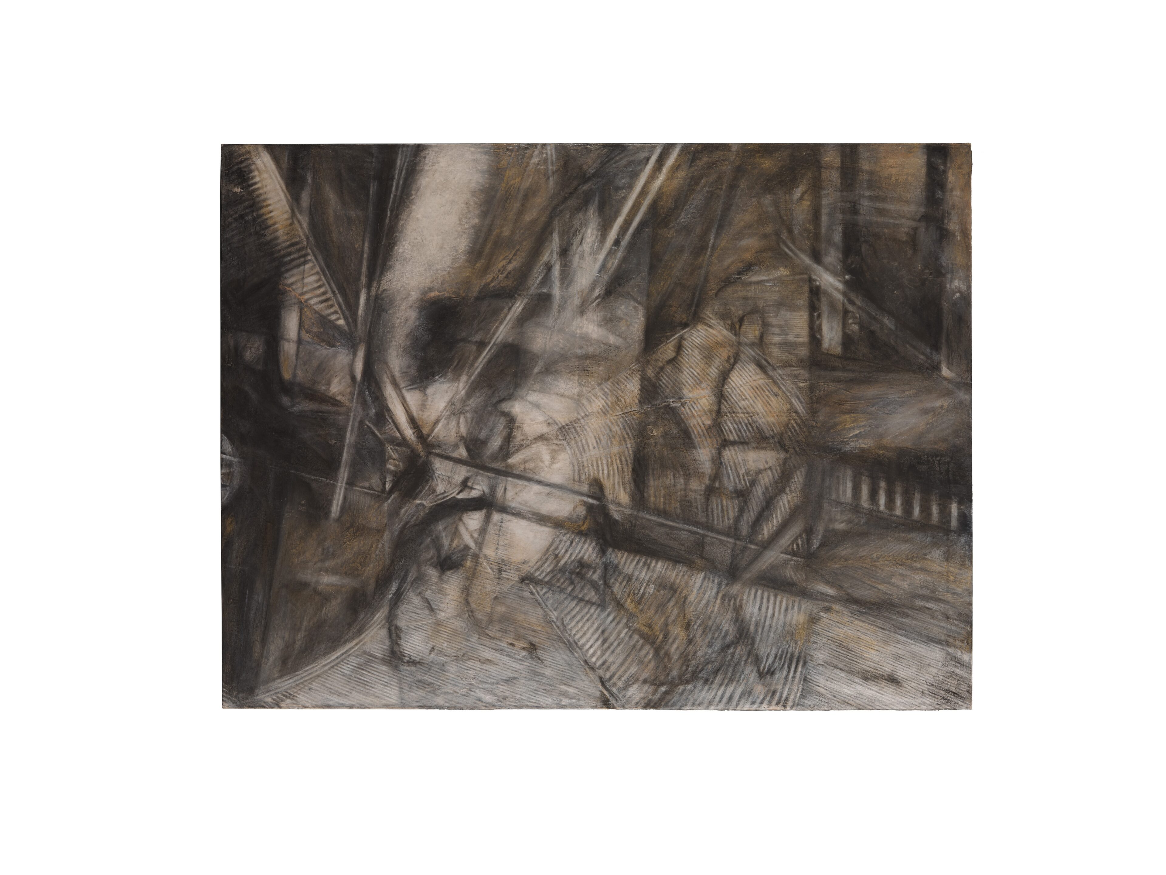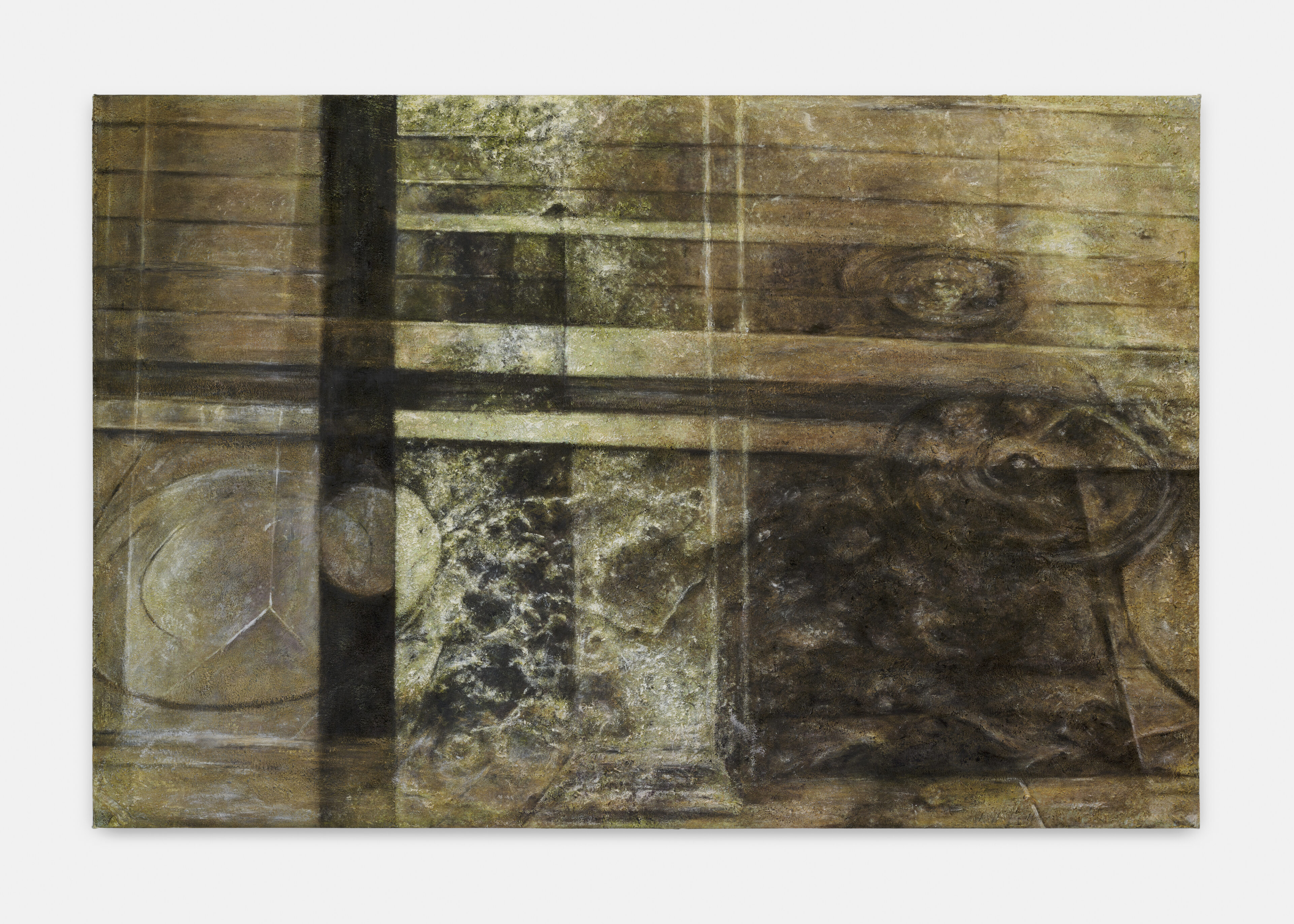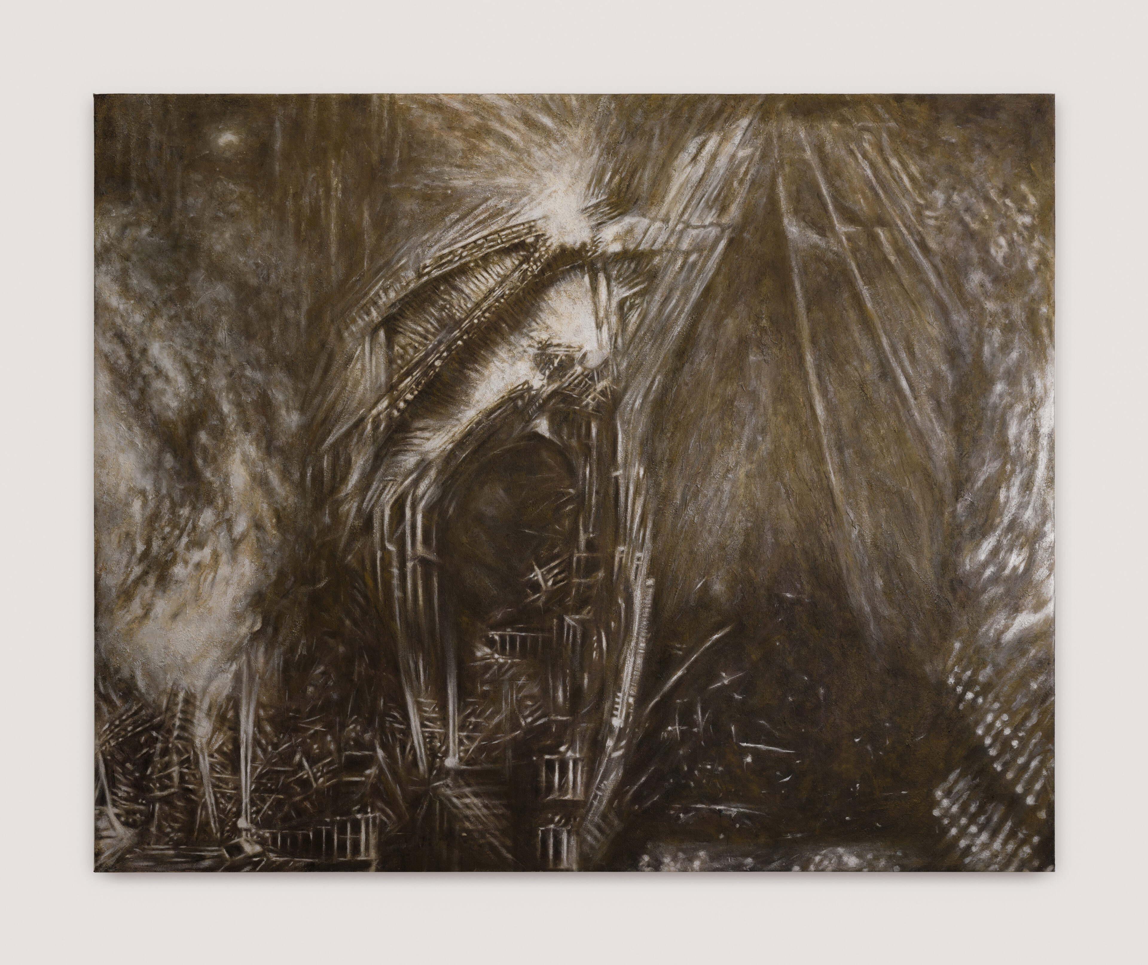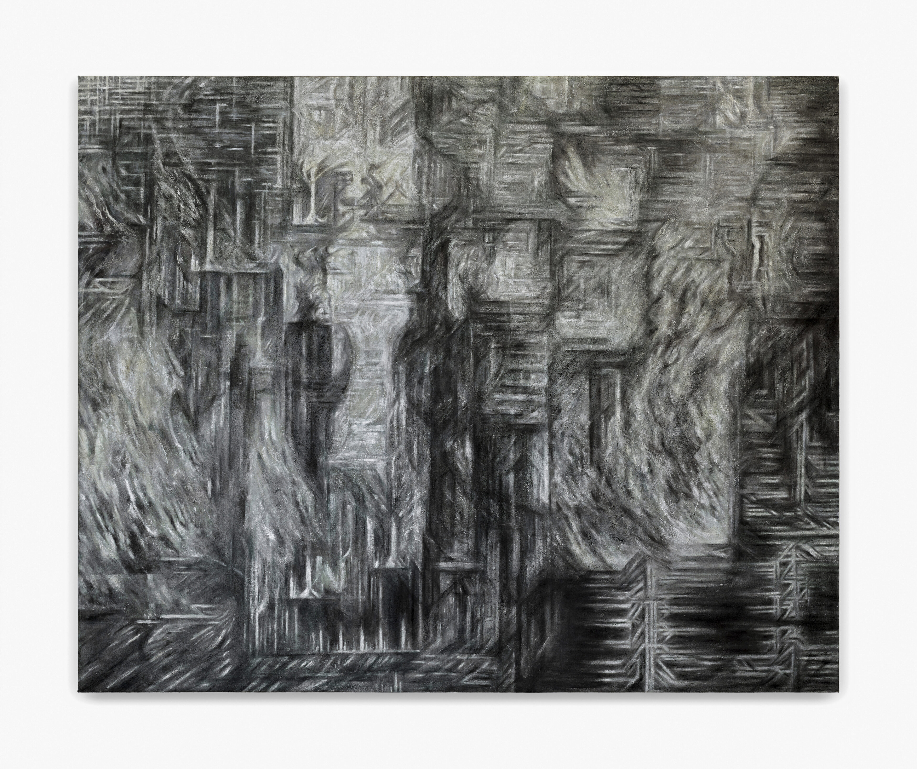 Over the years, Raissnia’s practice has unfolded within a permutational, self-reflexive structure. Her earlier architectonic black-and-white drawings echoed postwar European abstraction, composed of intersecting vectors. Since 2009, her Expanded Cinema practice—incorporating 16mm films and 35mm slides—has increasingly influenced her paintings. All three areas of her work—painting, drawing, and filmmaking—are interconnected and interdependent. Raissnia’s work balances the gestural and the photographic, the figurative and the abstract, creating ambiguous passageways and irrational architectures.