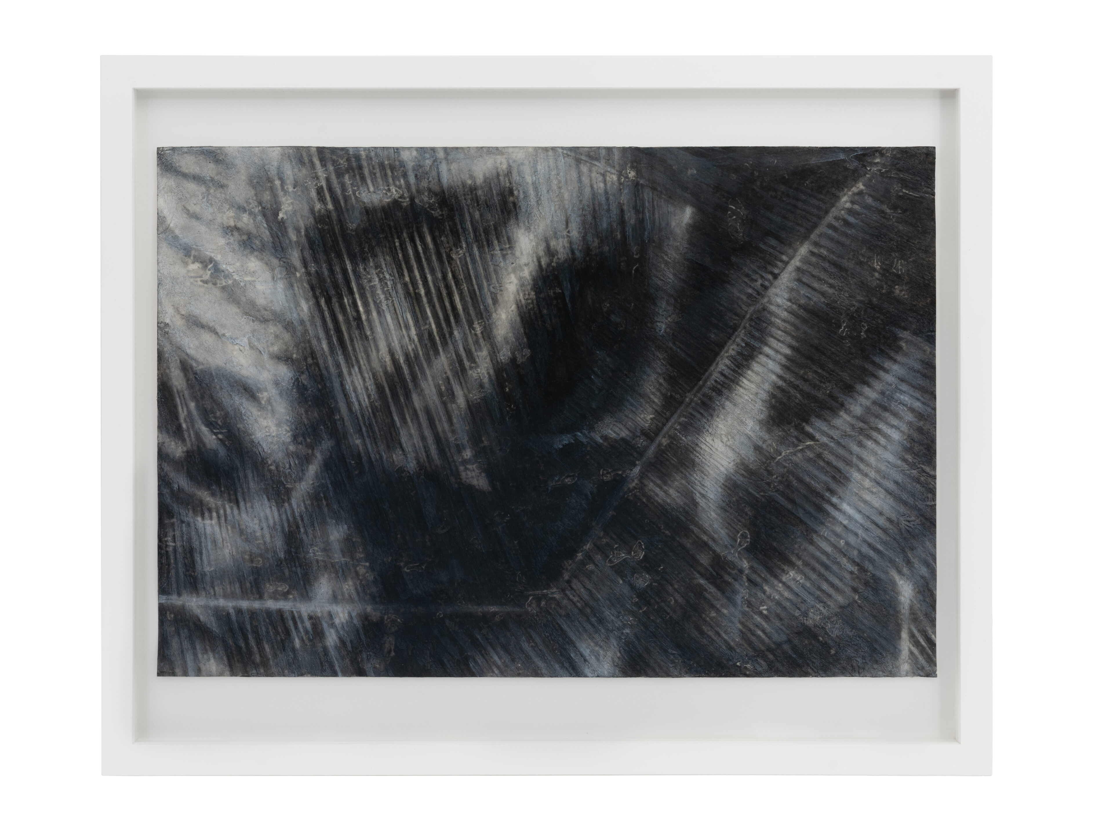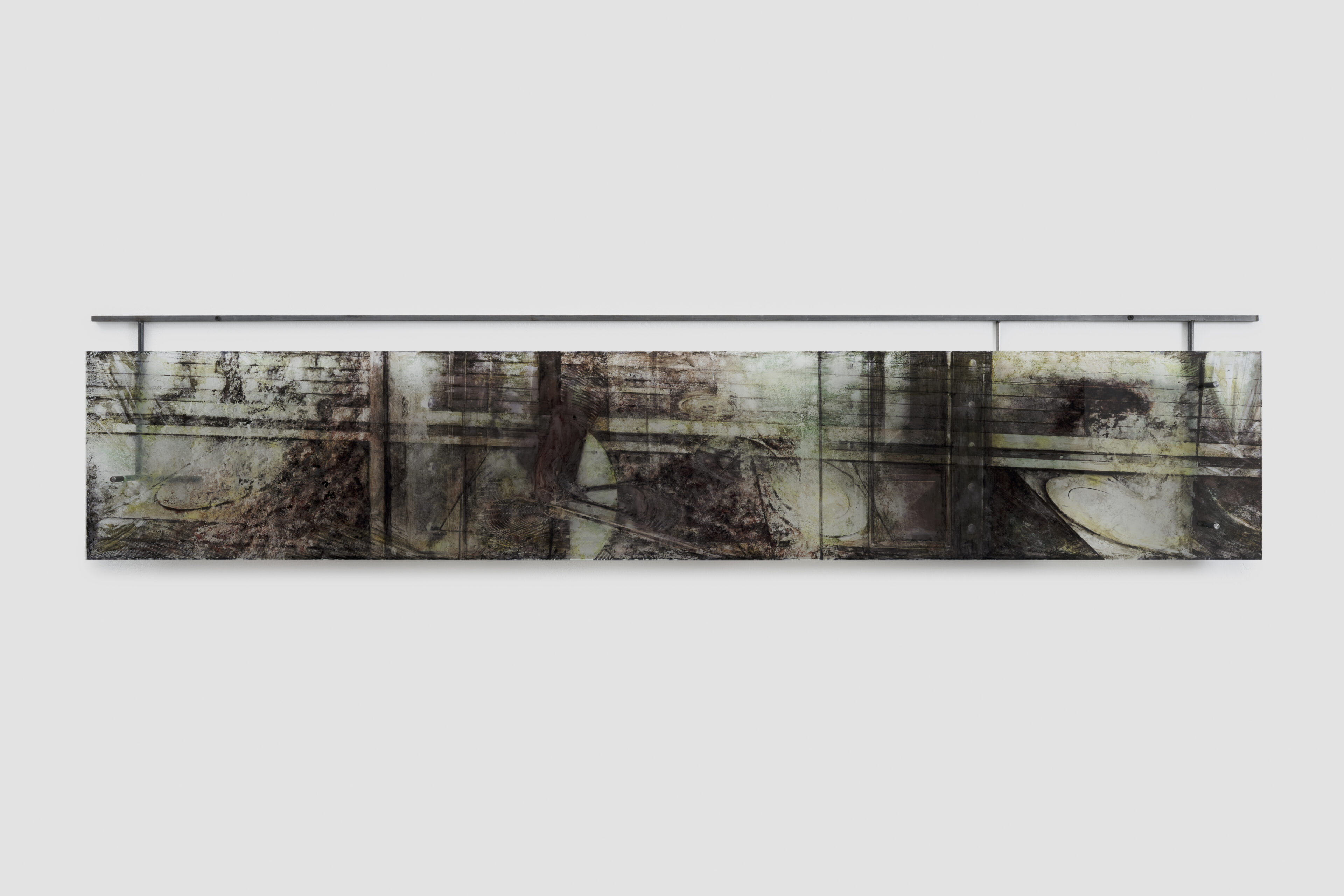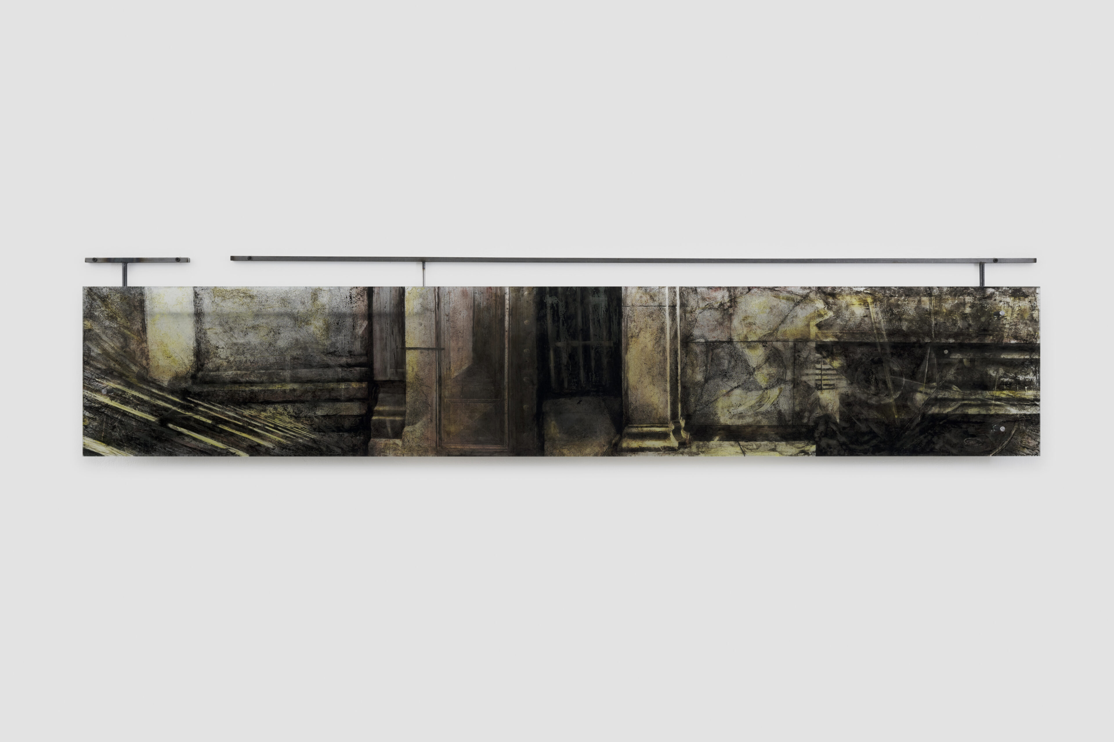 Eidolon II, 2023, UV-cured print on glass with hand painted sumi ink and guache, metal, 37.5 x 184 cm