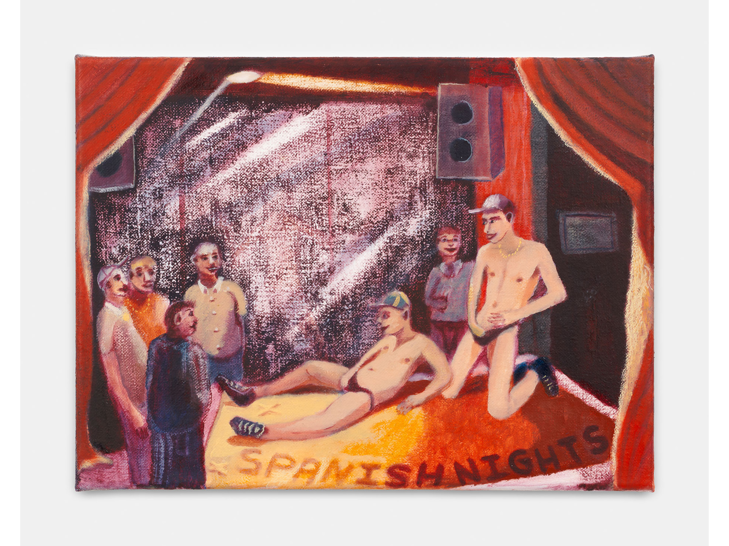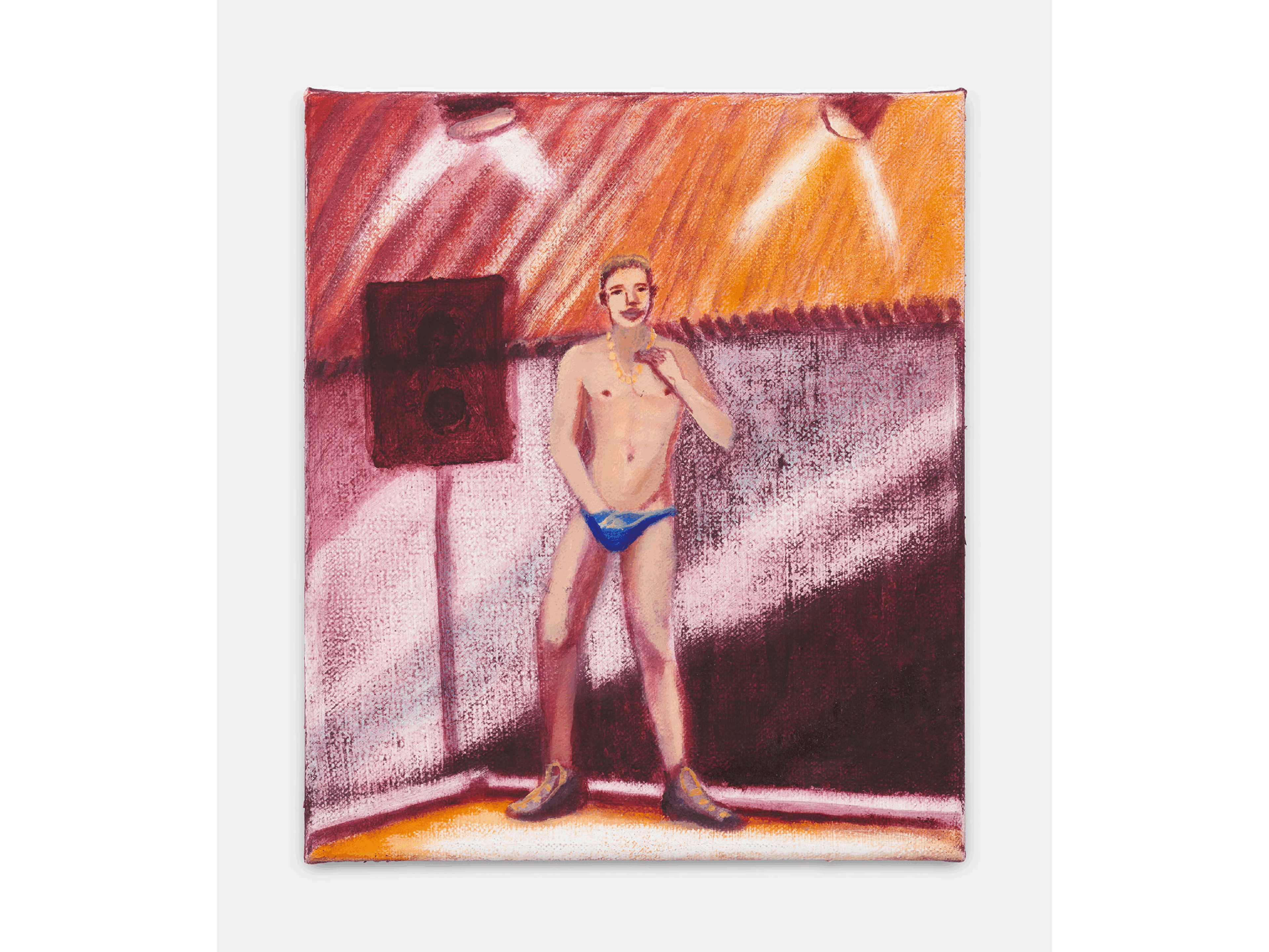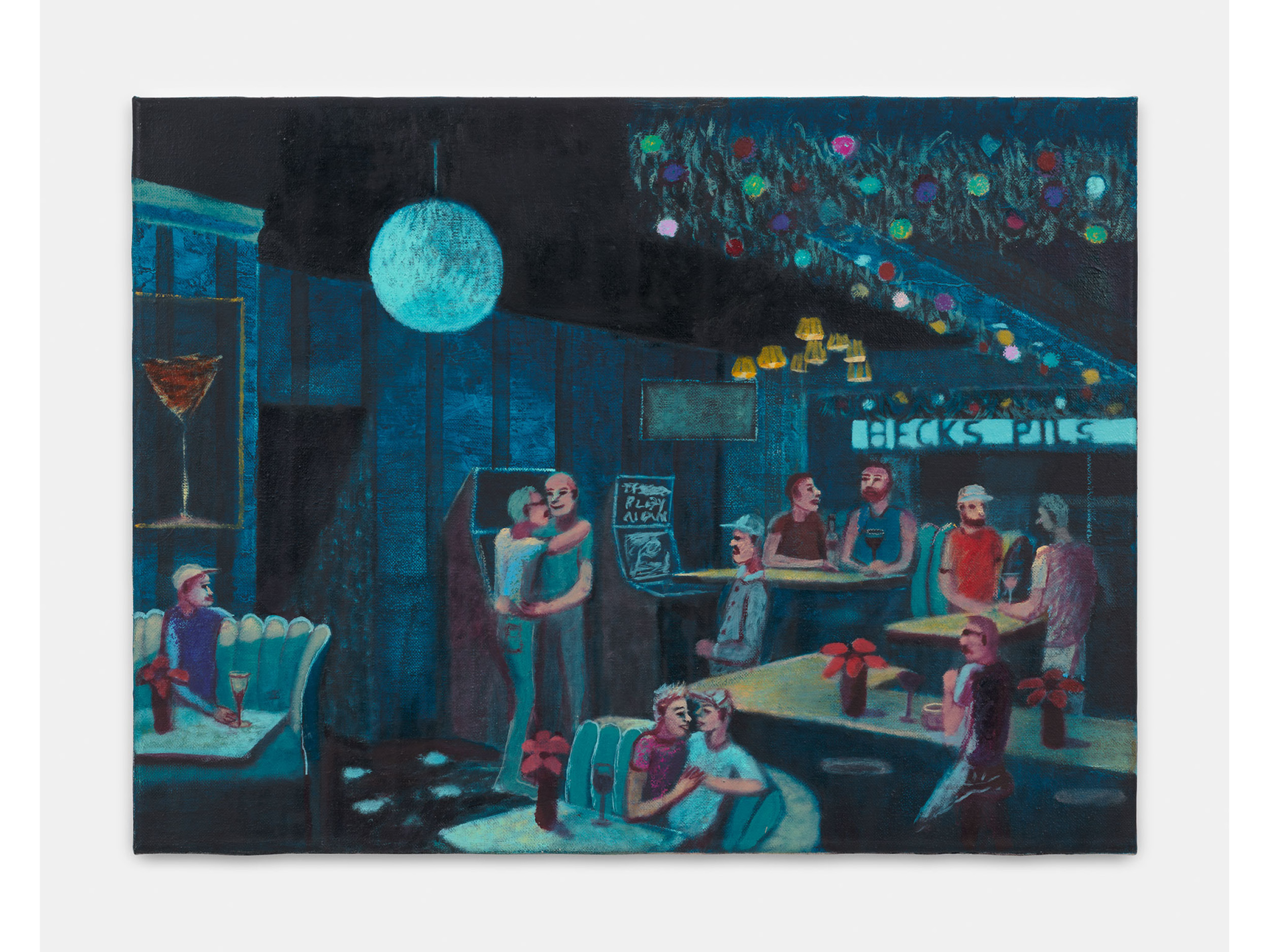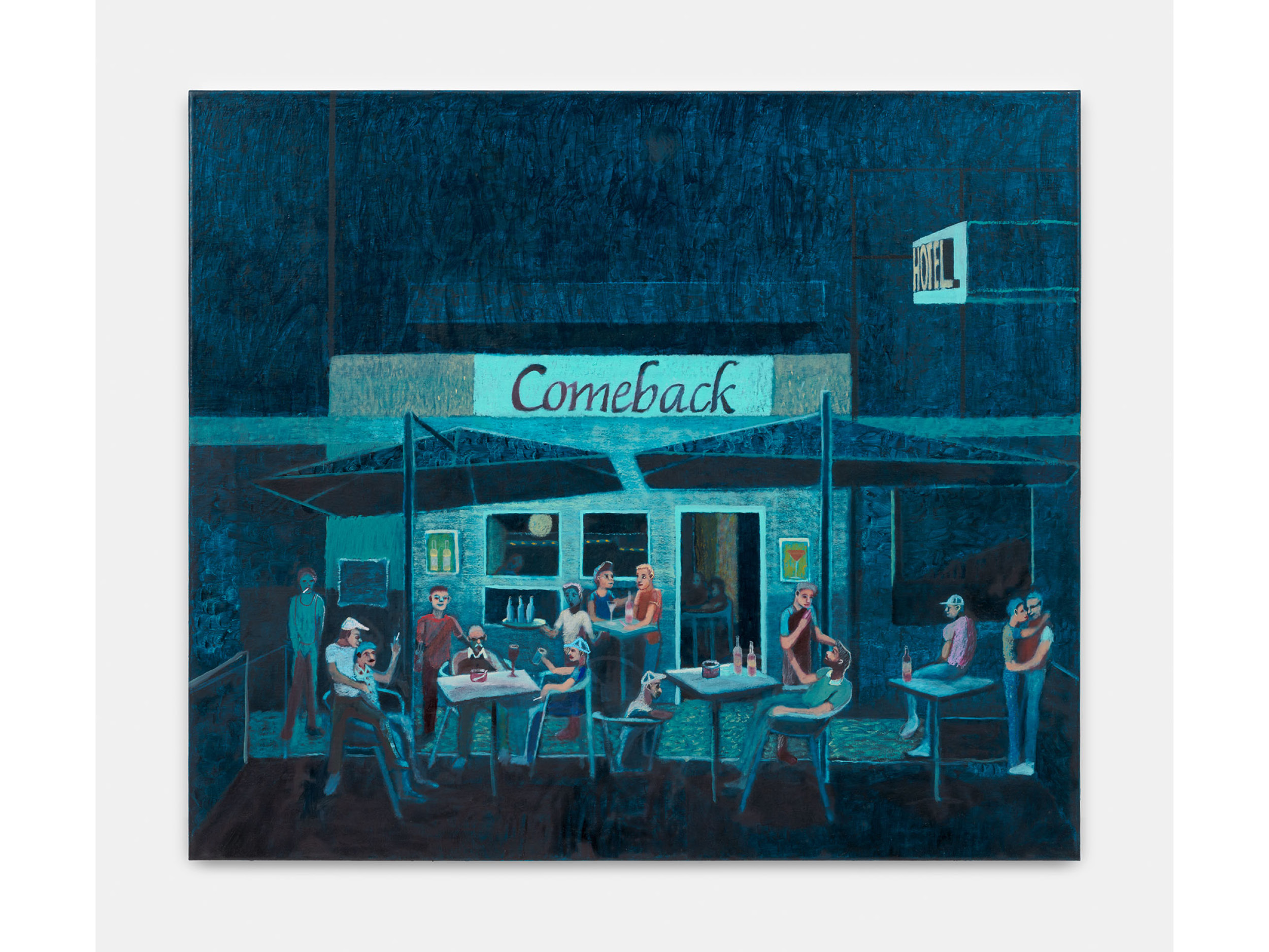 This new body of works consists of small- to medium-sized paintings made with oil on linen. They depict scenes from two German gay bars, one in Berlin called Tabasco and one in Düsseldorf called Comeback. Both have been around for a minute and came from a generation of places that gradually became vital for sex work and adjacent transactional desires. Huggins frequented them both. He spent time there, observing, understanding, following their operational codes, how they are, how they feel, how they come alive at night. Even though many sex workers now prefer to ply their trade online, these are spaces where good old fashioned hustling still pays off.