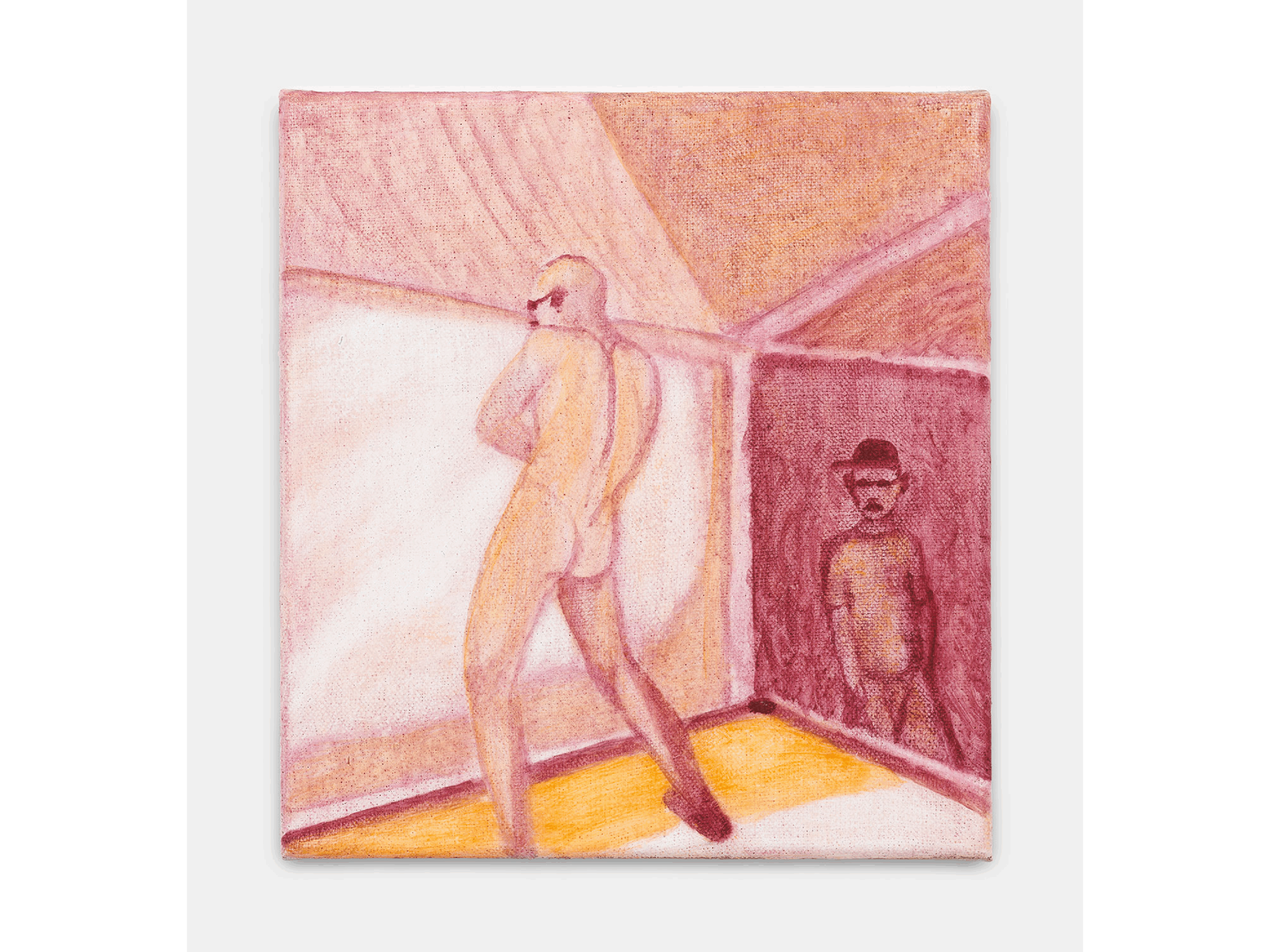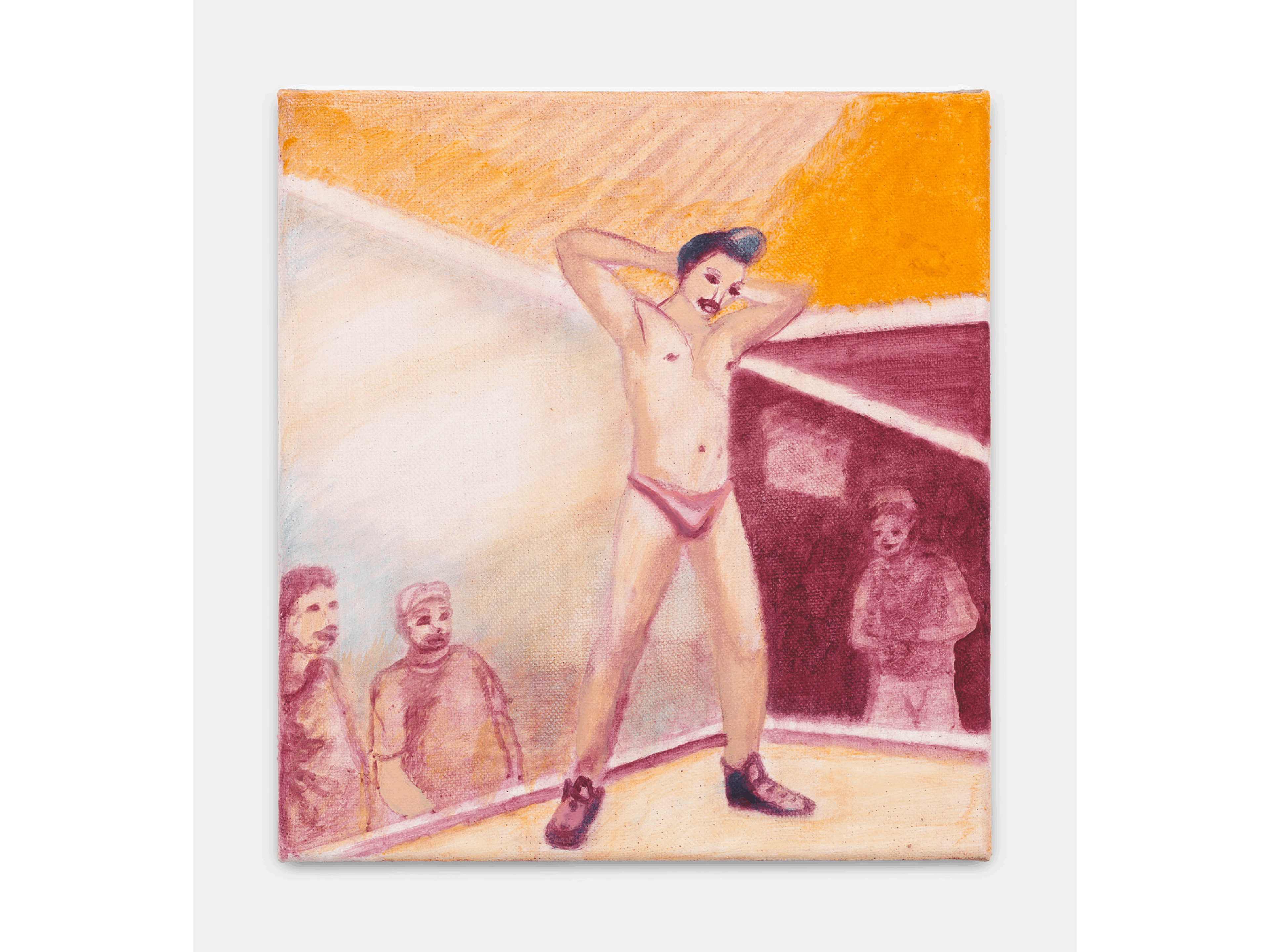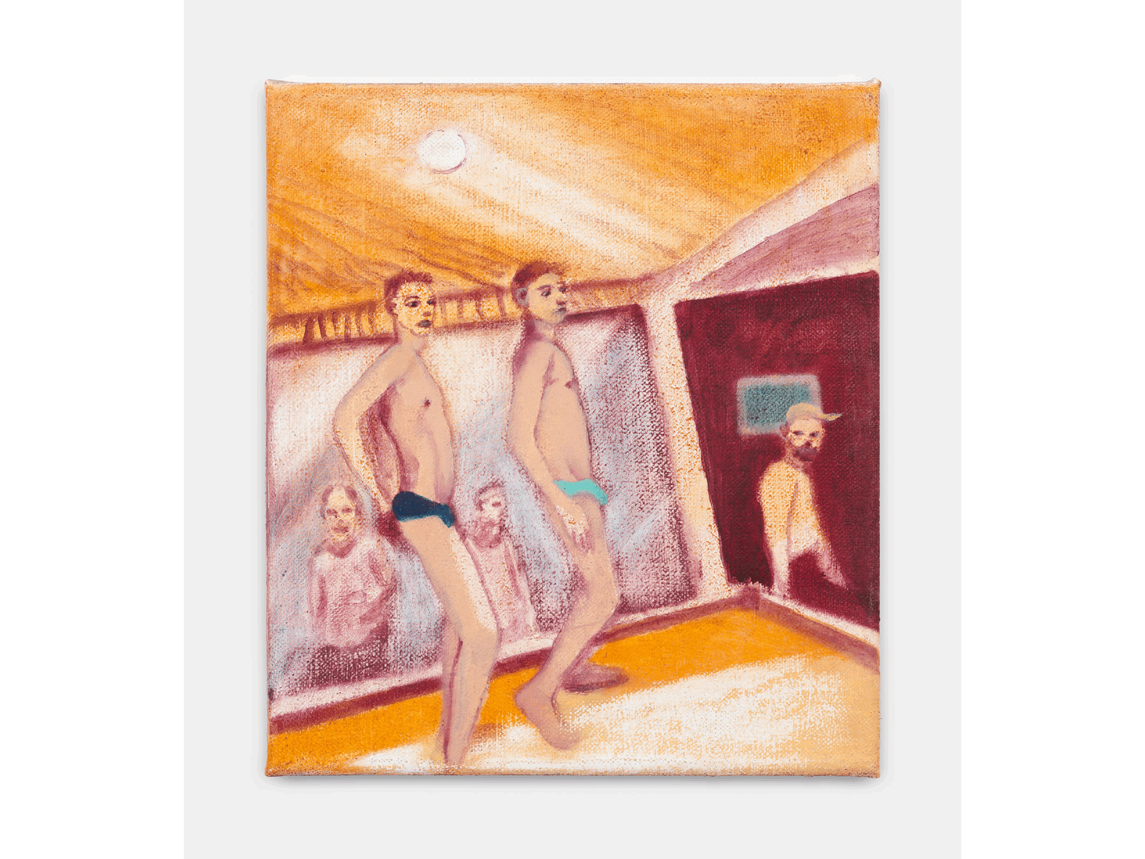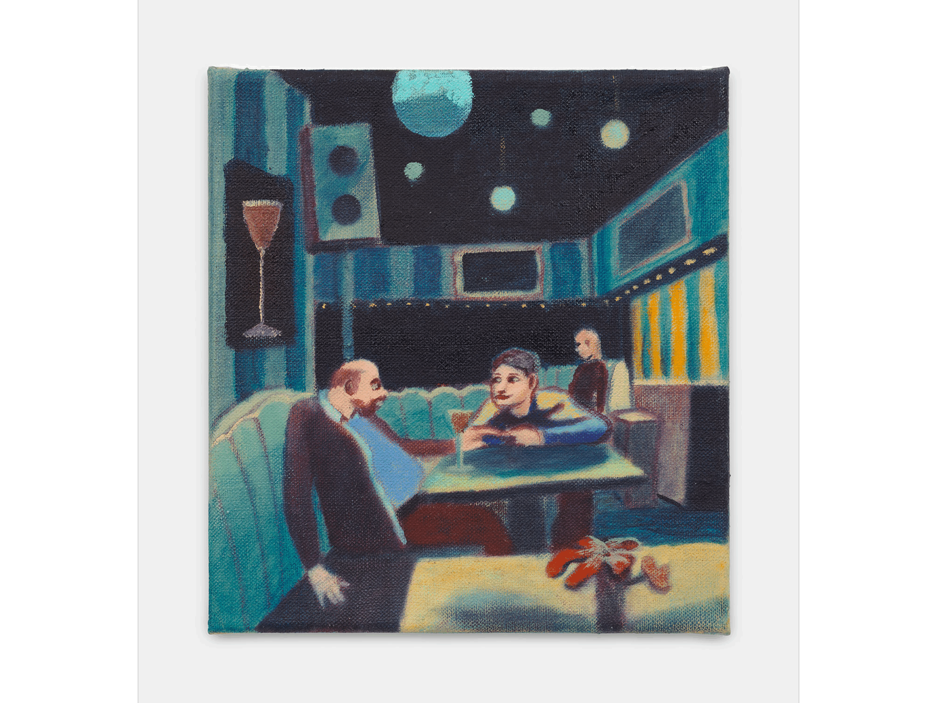 This new body of works consists of small- to medium-sized paintings made with oil on linen. They depict scenes from two German gay bars, one in Berlin called Tabasco and one in Düsseldorf called Comeback. Both have been around for a minute and came from a generation of places that gradually became vital for sex work and adjacent transactional desires. Huggins frequented them both. He spent time there, observing, understanding, following their operational codes, how they are, how they feel, how they come alive at night. Even though many sex workers now prefer to ply their trade online, these are spaces where good old fashioned hustling still pays off.