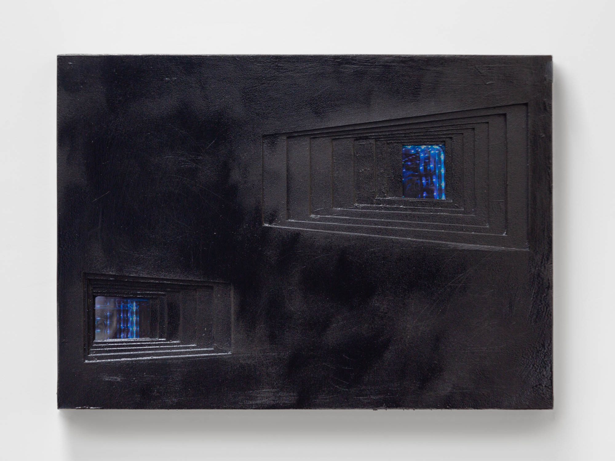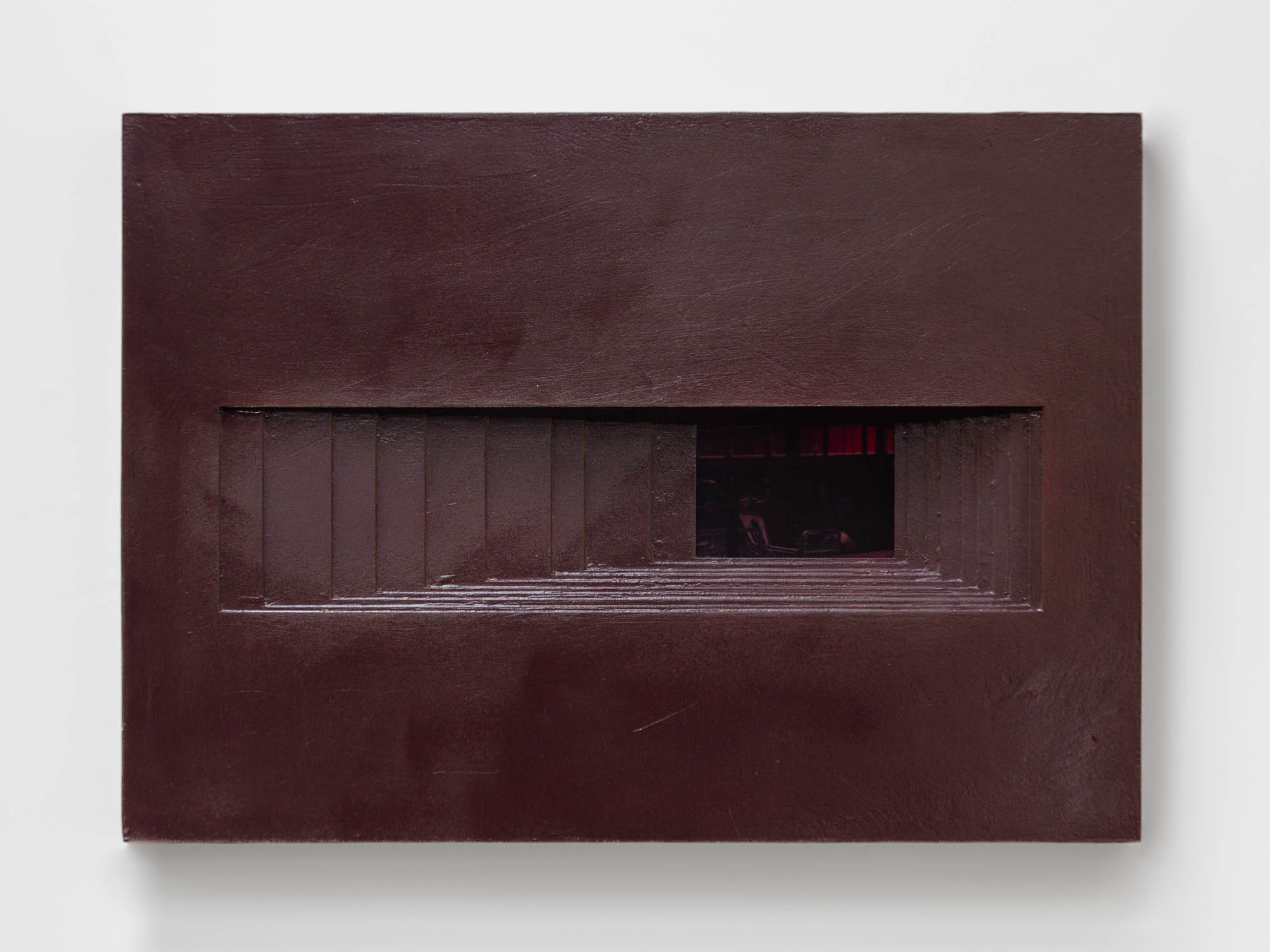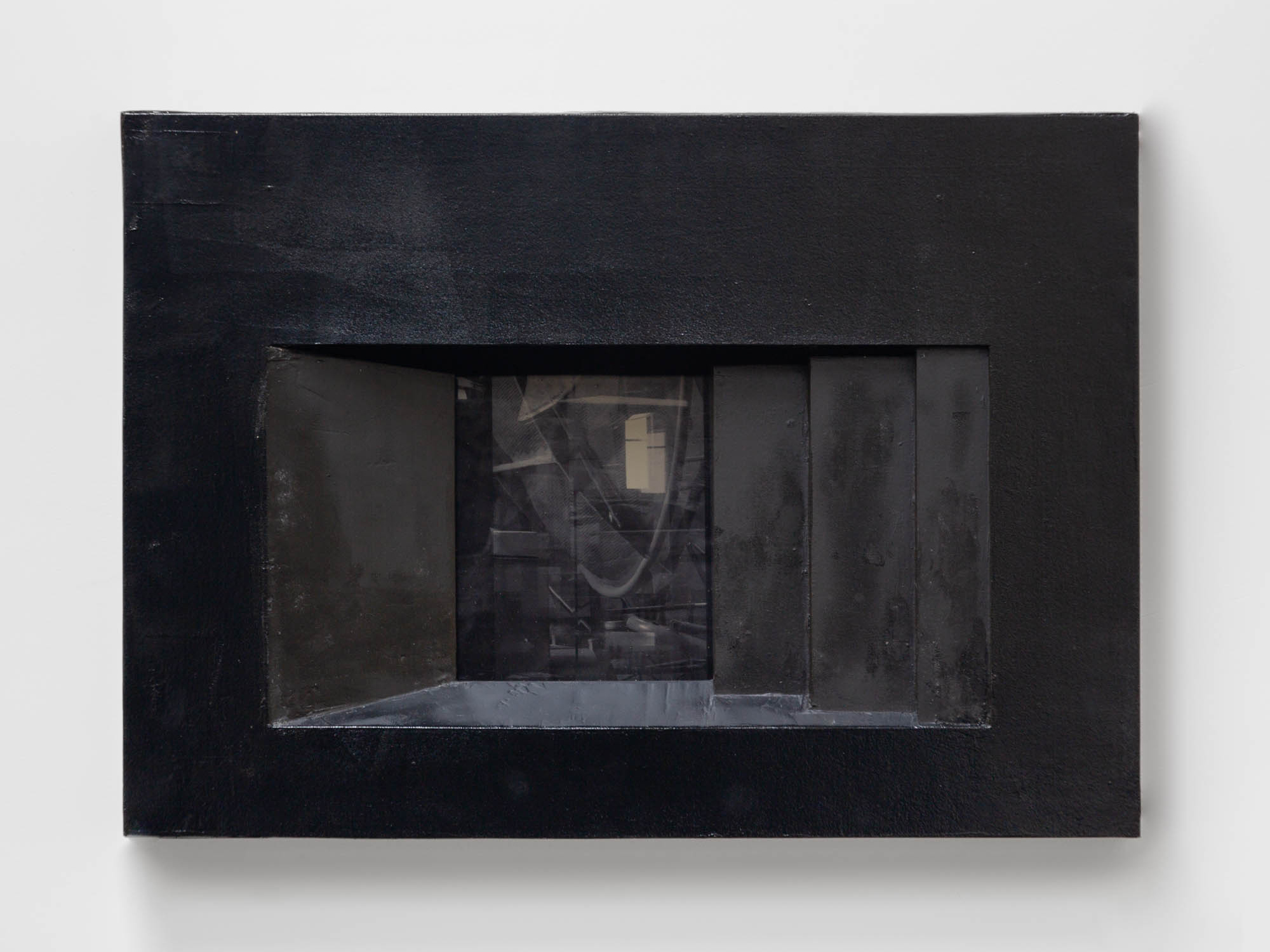 Overton Window II, 2025, Layered laser prints on projector film, mirorred dibond, acrylic glass, aluminium, foam board, plaster, lacquer, spray paint, 70 x 50 x 6 cm